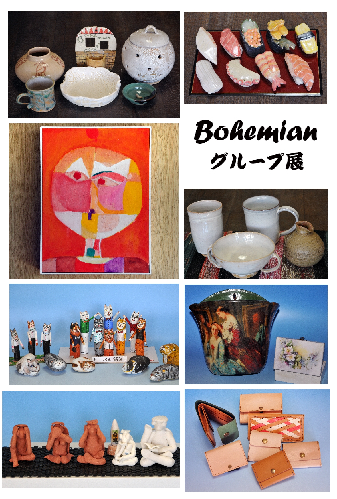 ニュース Bohemian グループ展 2022年5月14日 0live-moji 色々な繋がりのある8名のボヘミアン。それぞれの好きな事を新たに挑戦し、規制に捉われず 自由な発想で制作した作品展です。陶芸やアクリル画、水彩画、粘土、レザークラフト、シャドーボックス、多肉植物etc.(一部販売)展示します。何か始めようと思っている方、制作する楽しさも伝わりそうです! 是非お立ち寄り御覧ください♪ 2020年5月18日(水)~22日(日) 10:30~17:00(最終日は16時まで)