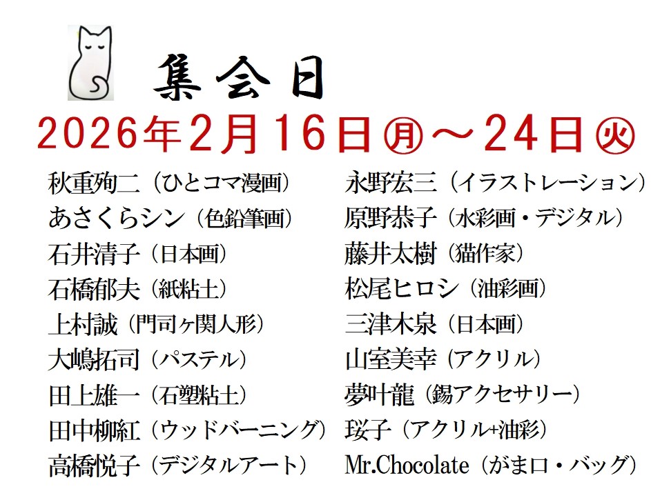 ニュース 猫企画展「猫草子」 2026年2月14日 0live-moji もうすぐ2月22日の猫の日、第12回目の猫企画展が始まります。今年のタイトルは「猫草子」。18名の猫好きな作家による想いを込めた猫作品が並びます。 油彩やアクリル、日本画、パステル、色鉛筆、デジタル、のほかウッドバーニングやイラストレーション。造形では紙粘土や石塑粘土、布で作った猫、今回初めて展示される藤井太樹さんの巨大看板猫!是非ご覧下さい! 会期 2026年2月16日(月)~24日(火) 10:30~17:00(最終日は16時まで)